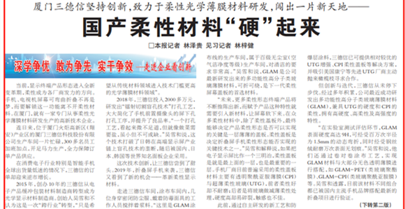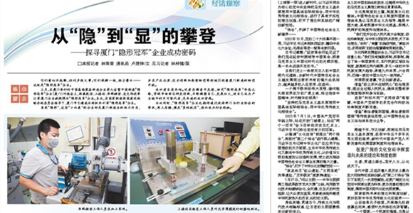 6月23日,《福建日报》经济版对华晔、厦门三德信、麦克玛视、长塑实业4家隐形冠军企业进行宣传报道,展示这些企业的独到之处。