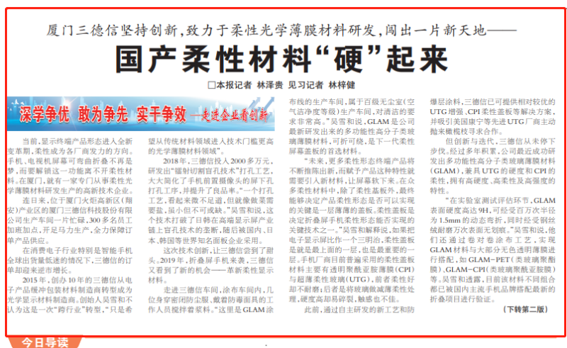 为大力宣传中国制造“隐形冠军”,推广隐形冠军企业的奋斗历程、成功经验和发展模式,引导制造业高质量发展,《福建日报》与【火博体育(中国)有限公司官网】联合陆续推出“隐形冠军”专题报道。以下是专题报道第一篇厦门三德信(协会会员企业)的宣传报道,《国产柔性材料“硬”起来——厦门三德信坚持创新,致力于柔性光学薄膜材料研发,闯出一片新天地》,刊发于今日《福建日报》头版。